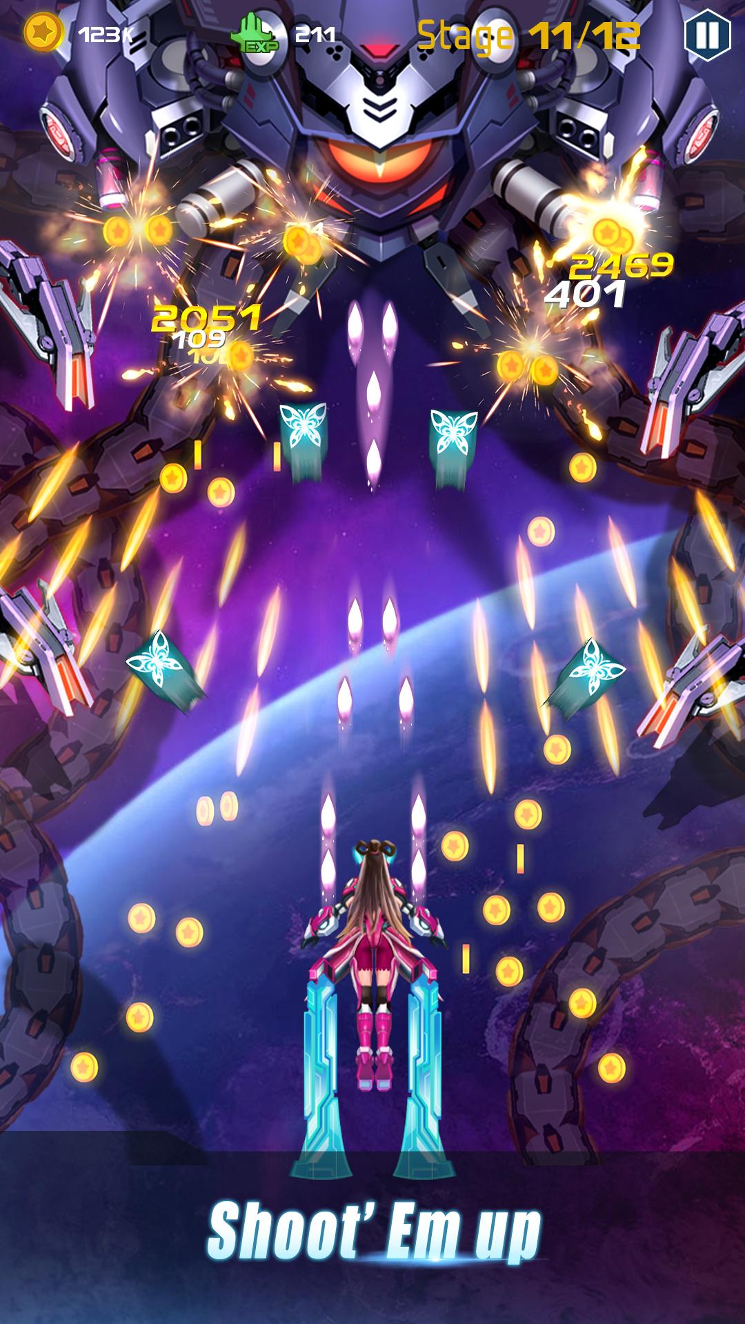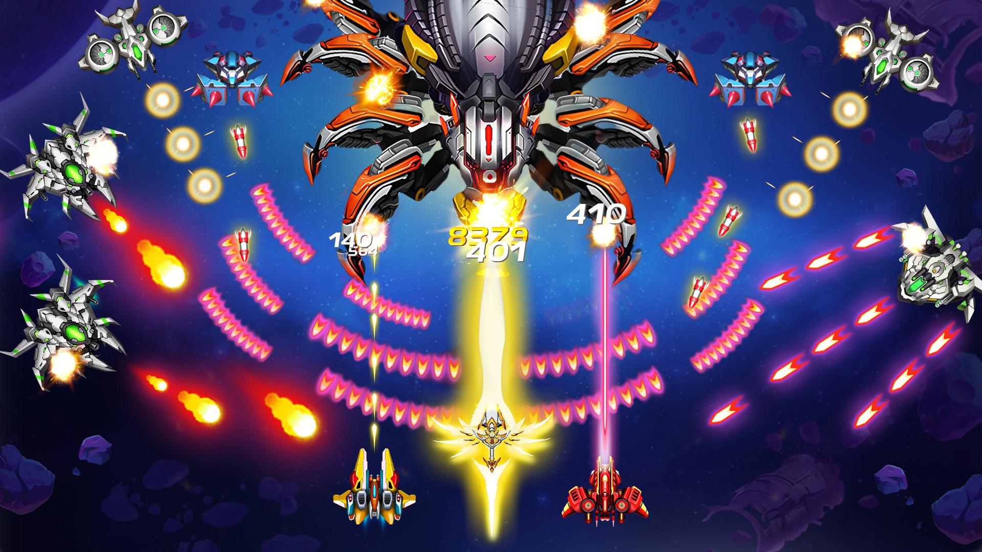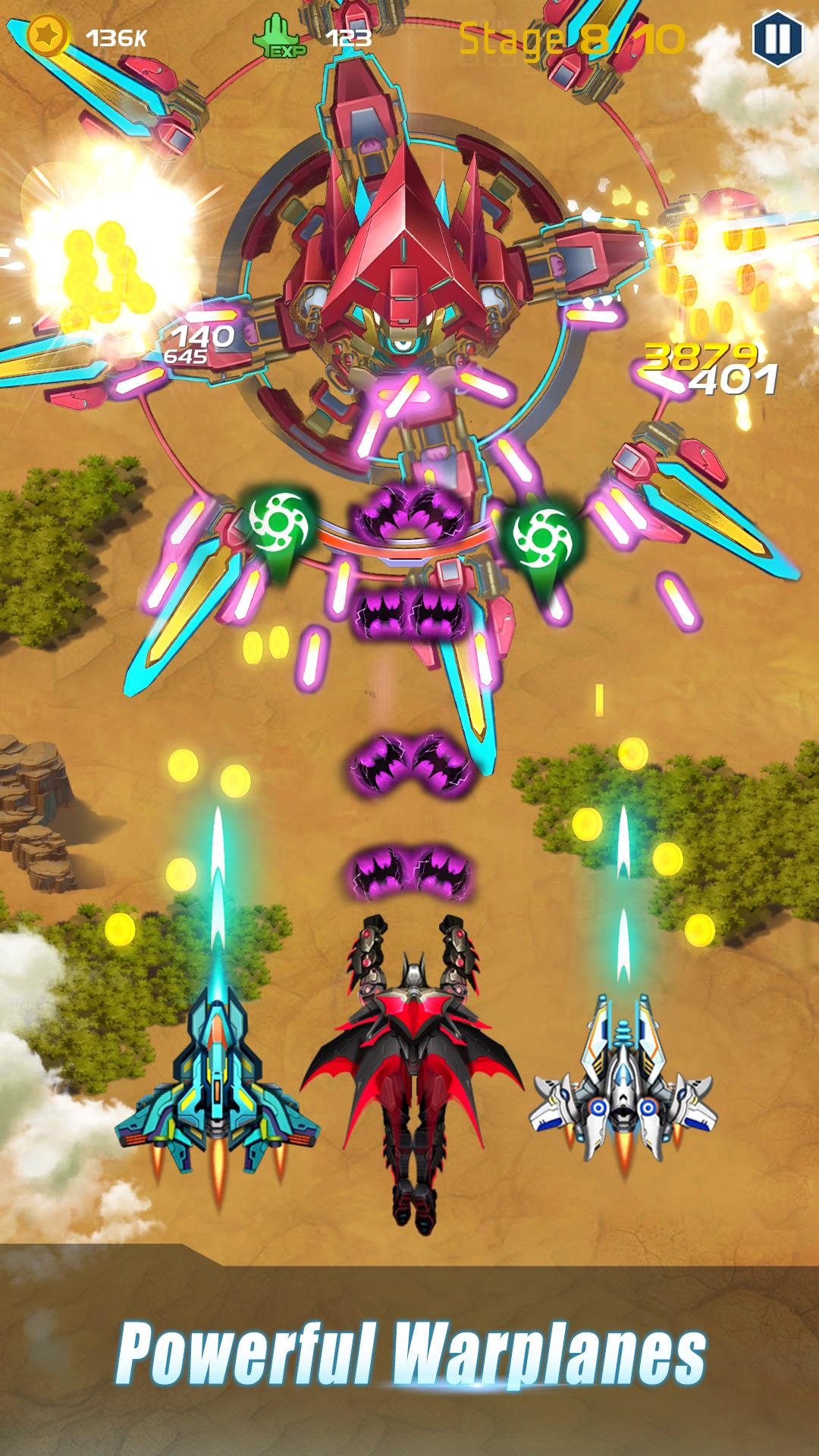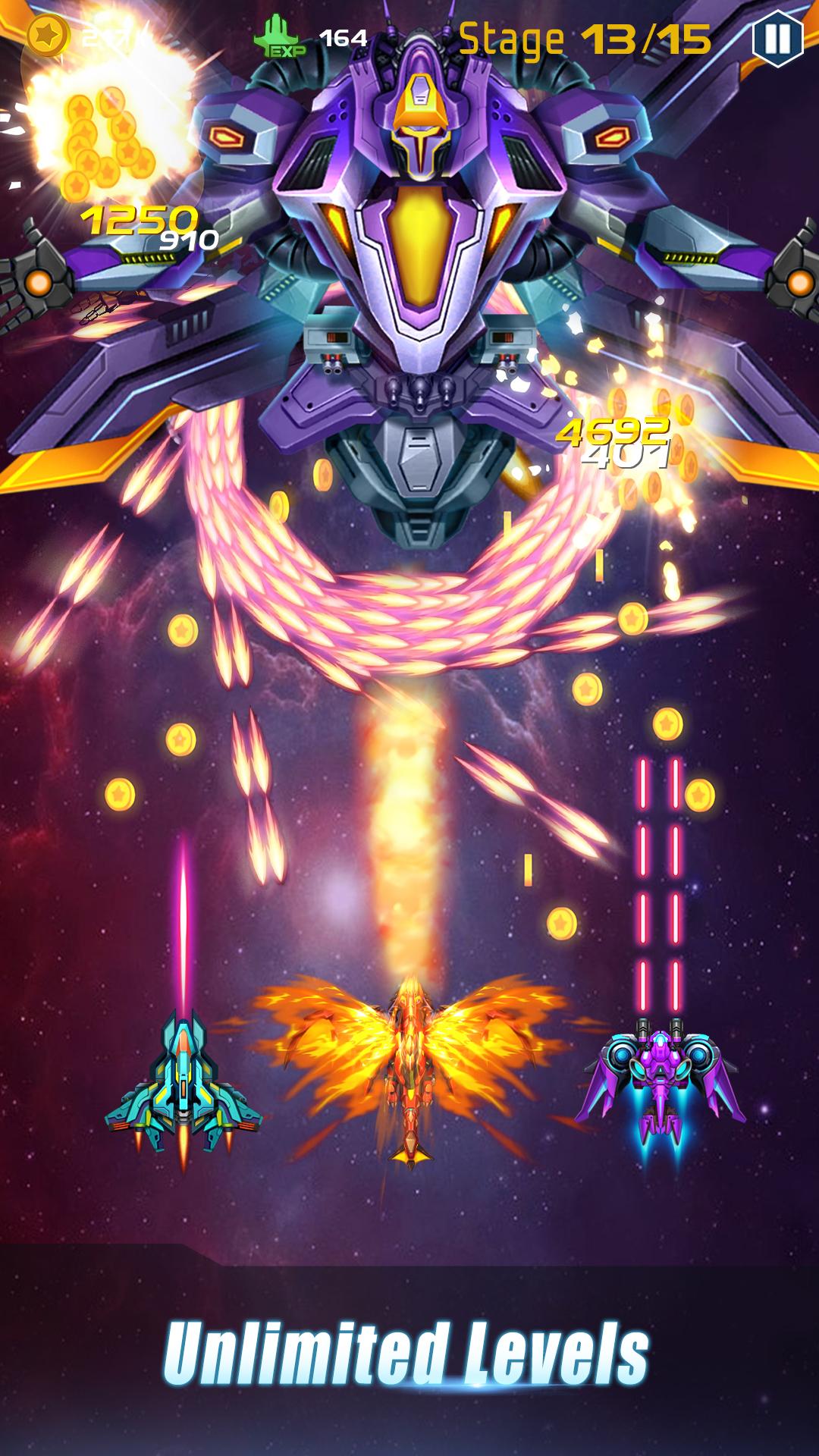 Players can choose from over 11 powerful fighters, each with unique abilities and upgrade paths. The game features intuitive controls, allowing players to slide to control their fighter and avoid enemy bullets, enhancing the overall gaming experience.