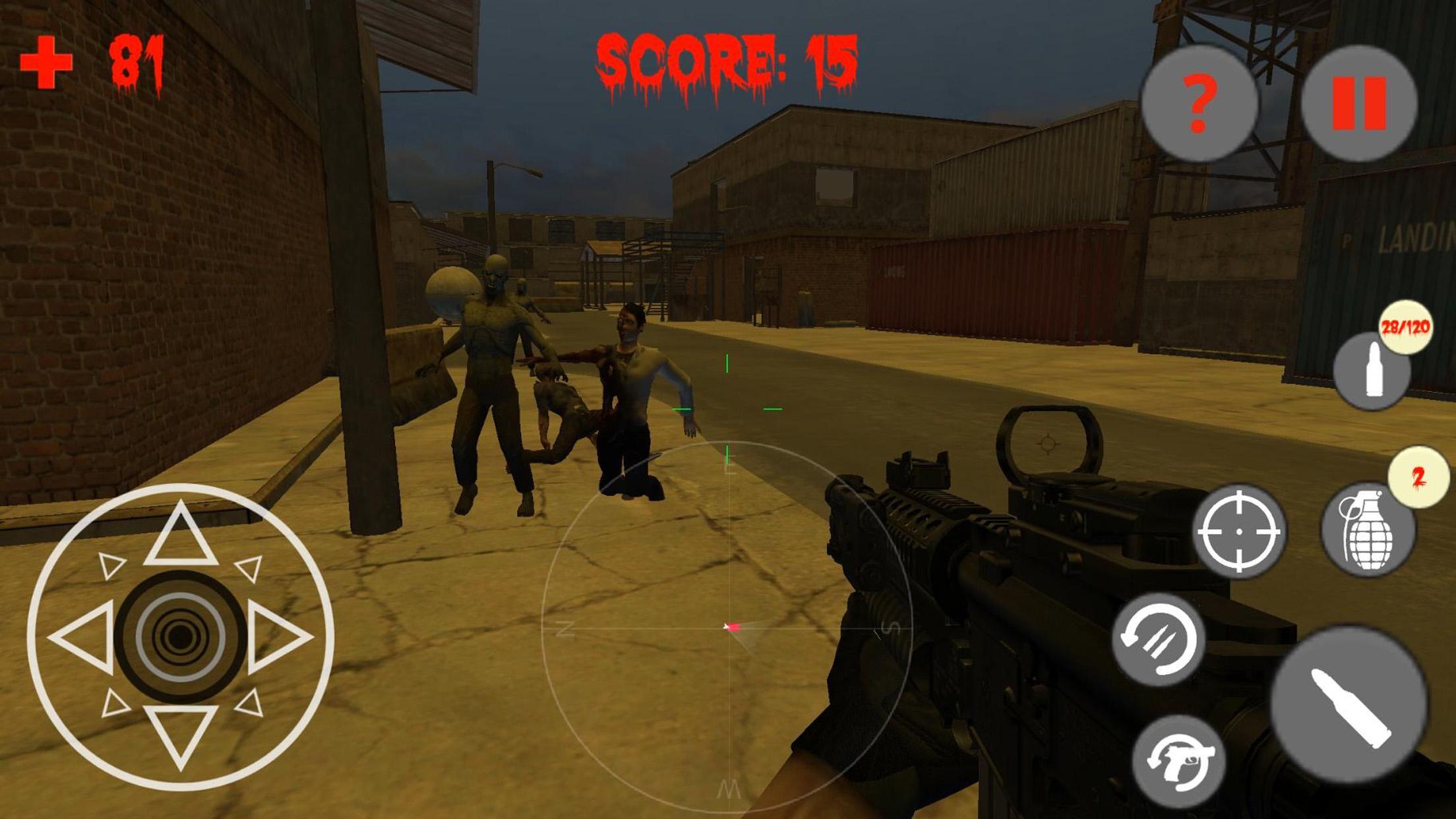 Players control survivor characters using a virtual joystick for movement and on-screen buttons for aiming, shooting, and throwing grenades. Shortcut icons let players instantly switch between weapons, activate health kits, and call drone strikes during intense waves of zombie attacks.