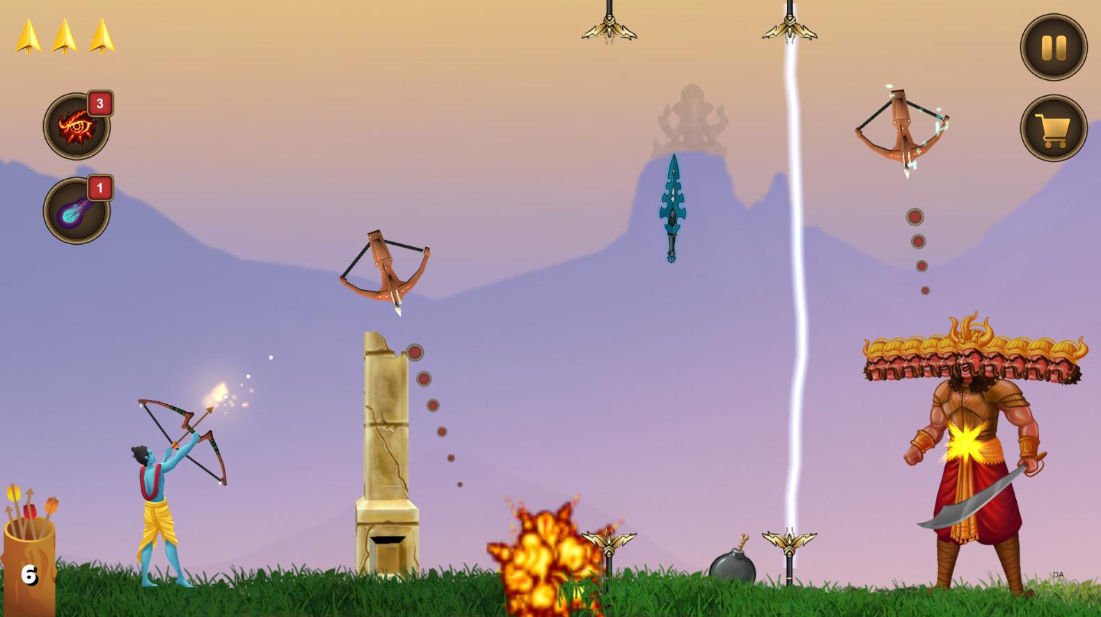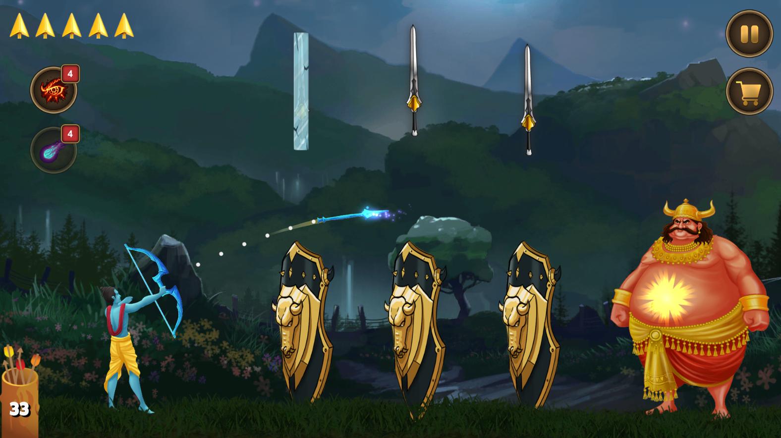 Players control Lord Ram using swipe and tap gestures. Shortcut buttons allow quick access to special attacks, power-ups, and health boosts during battles for survival.