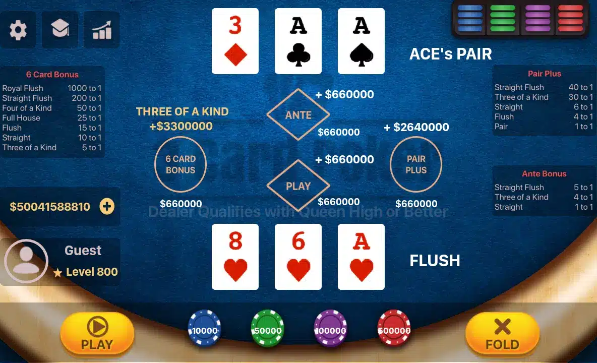 Immerse yourself in a remarkably realistic gaming environment that transports you to the heart of Las Vegas. Enjoy the authentic casino atmosphere as you engage in table games on 3 Card Poker Casino. Whether you’re playing for practice, relaxation, or pure enjoyment, the experience is unparalleled.