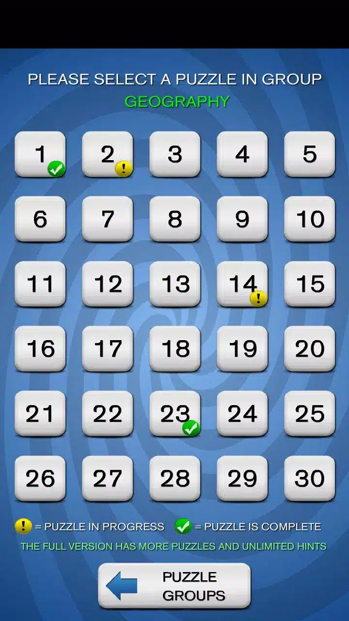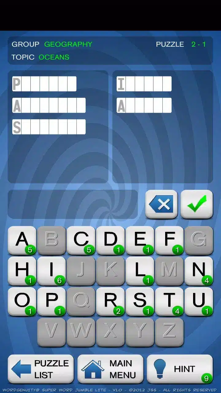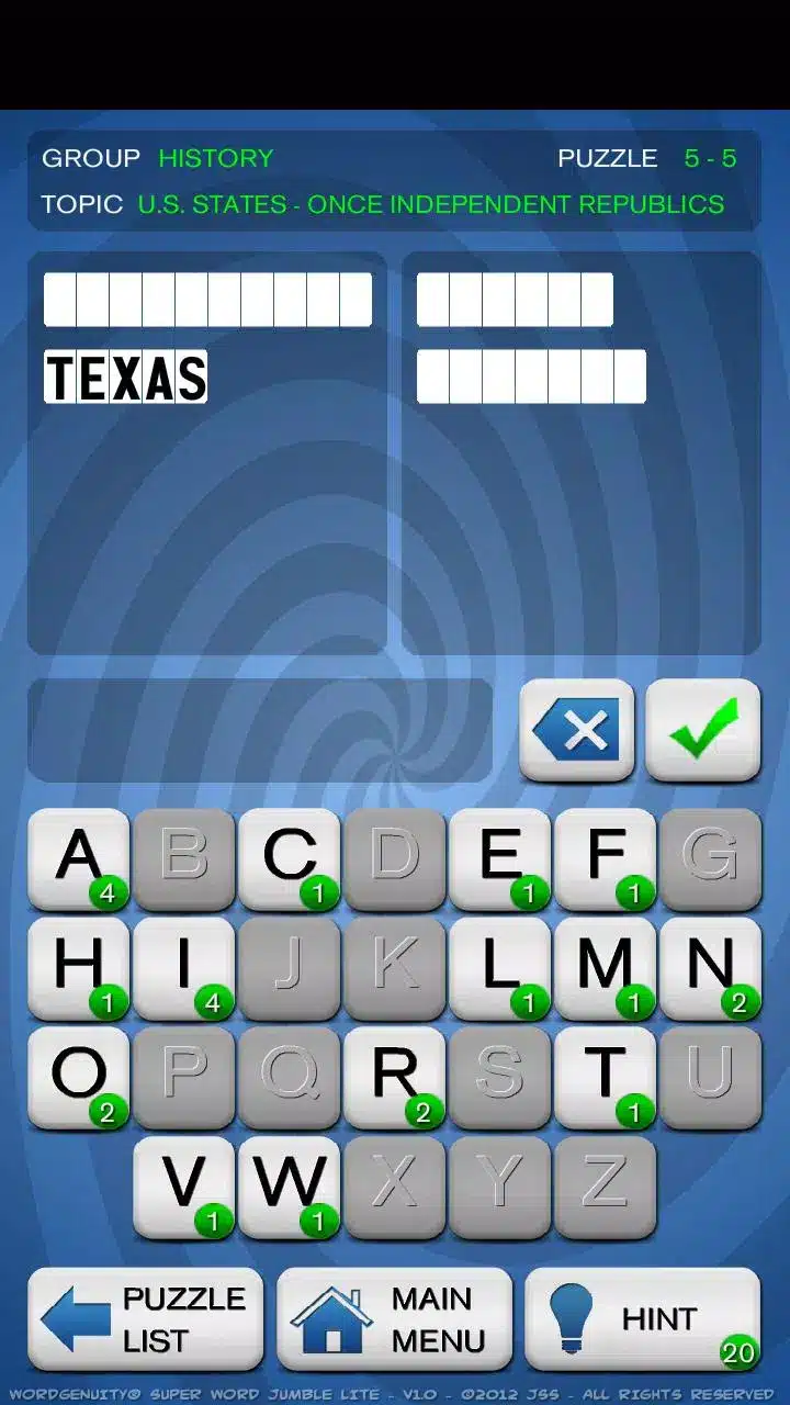 The lite version comprises 100 puzzles with numerous words to unscramble, along with an initial allotment of 20 hints. The full version offers 300 puzzles, featuring almost 2000 words to unscramble. Additionally, the full version permits an unlimited number of hints.