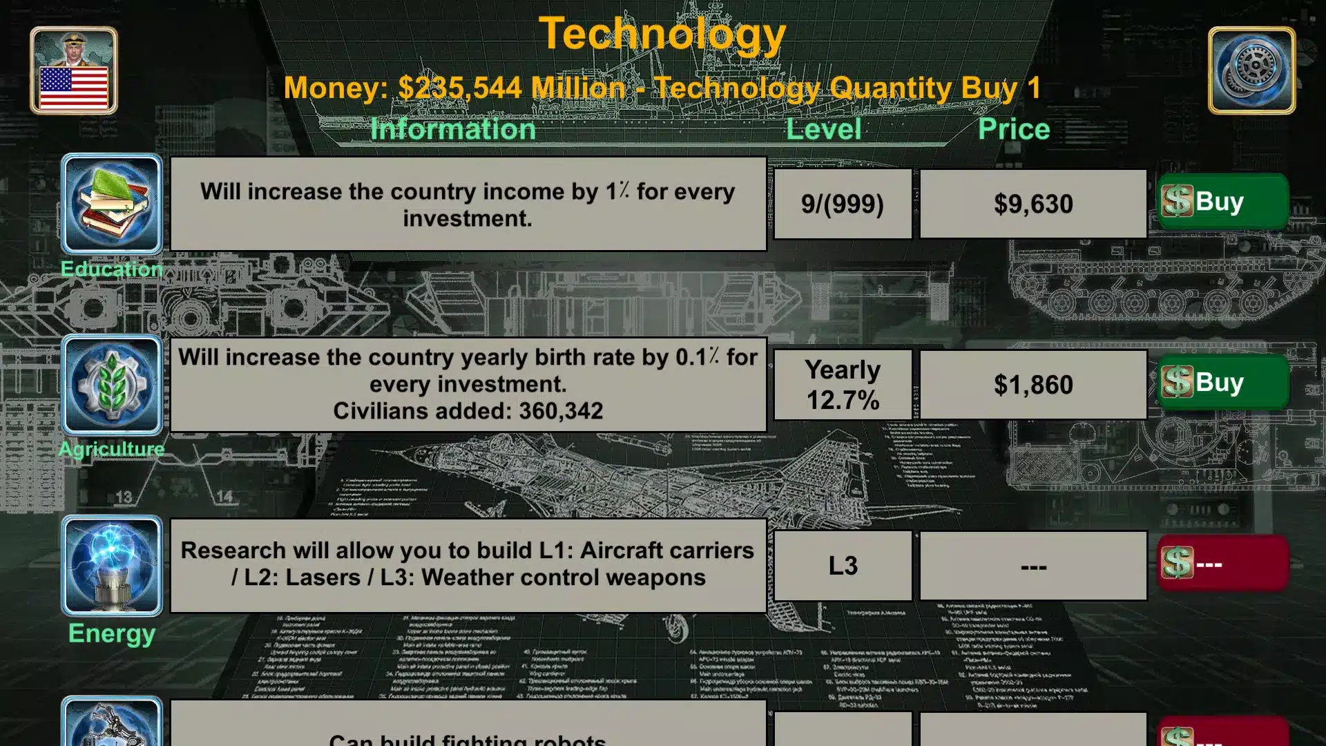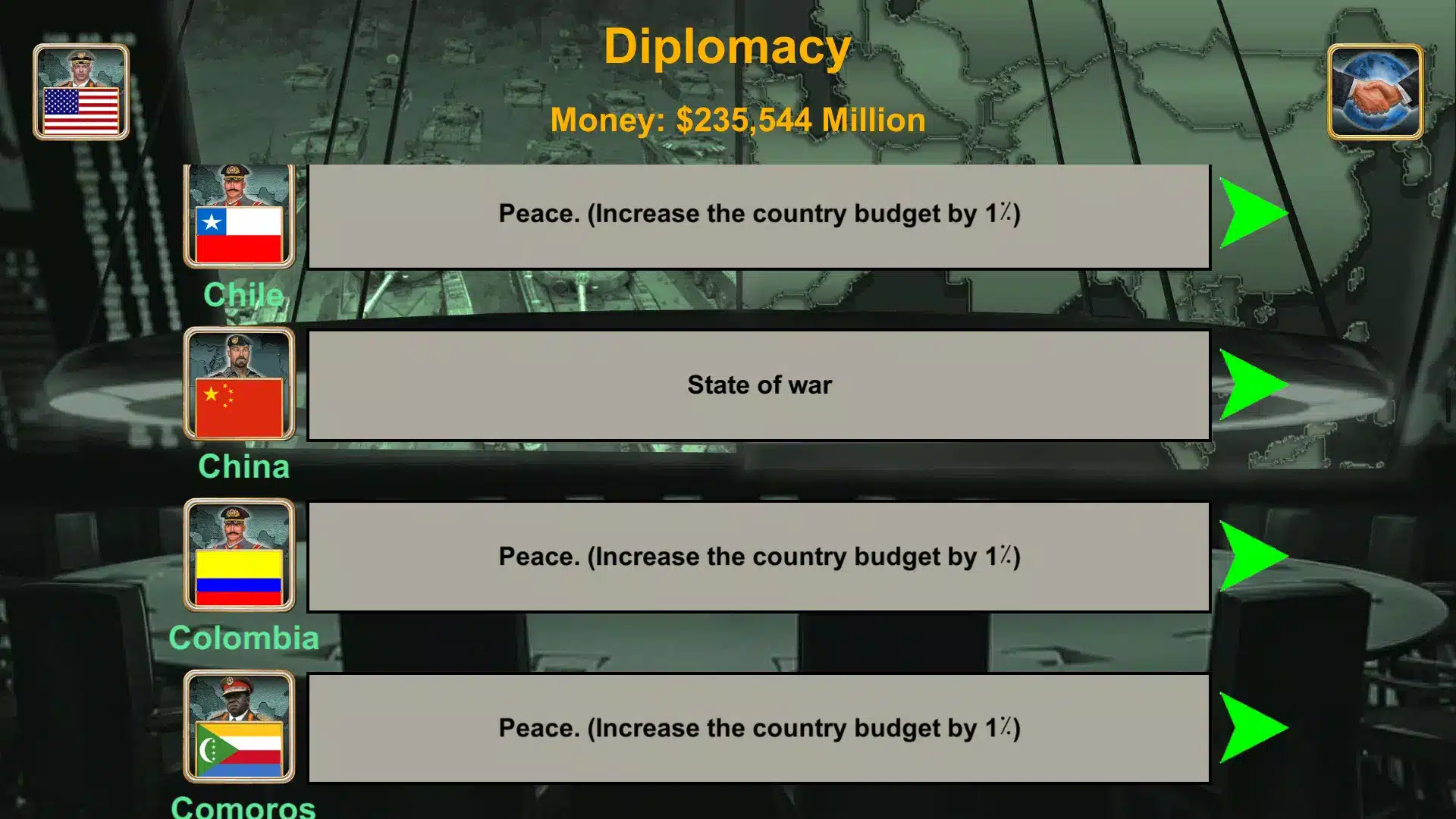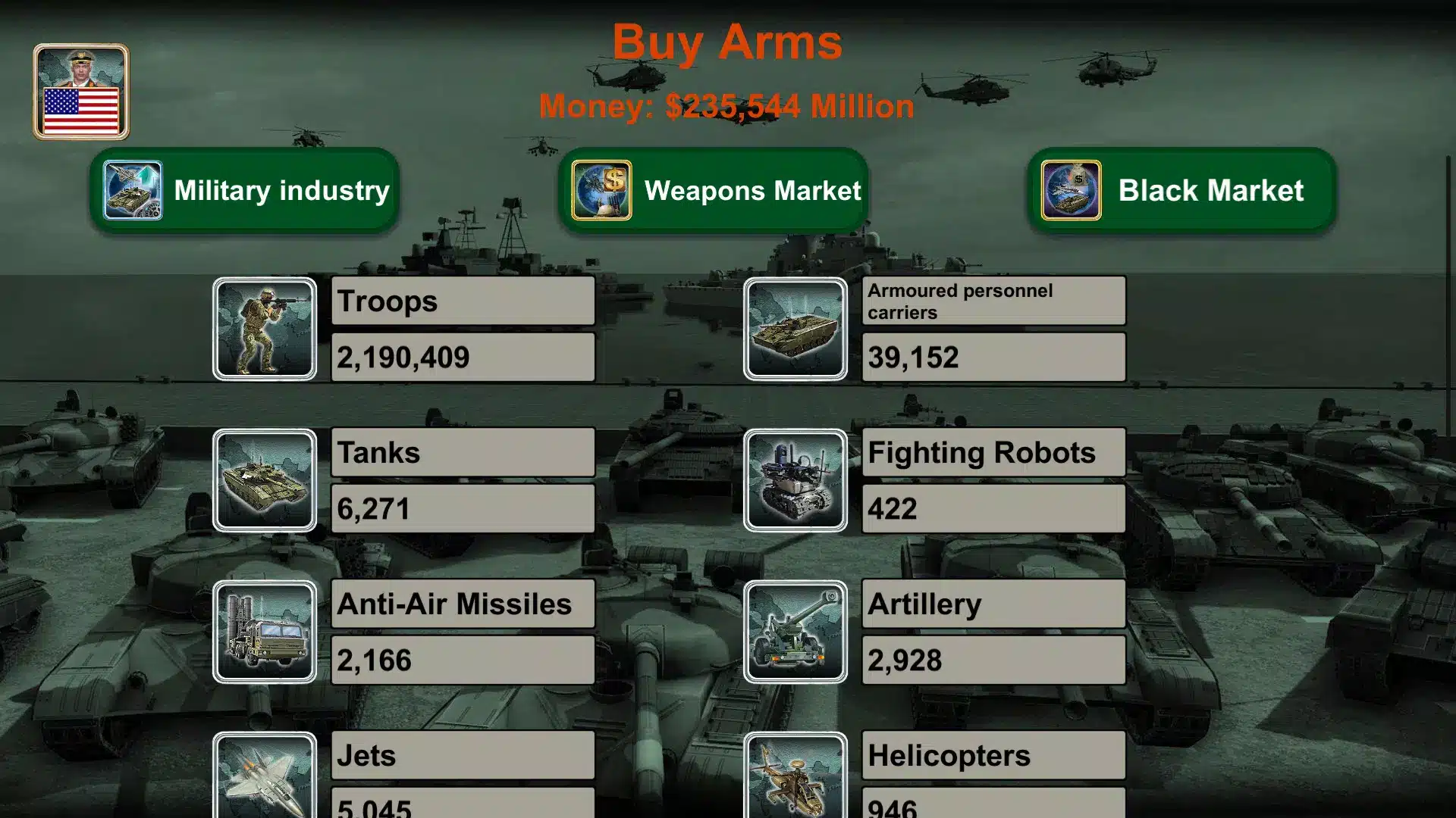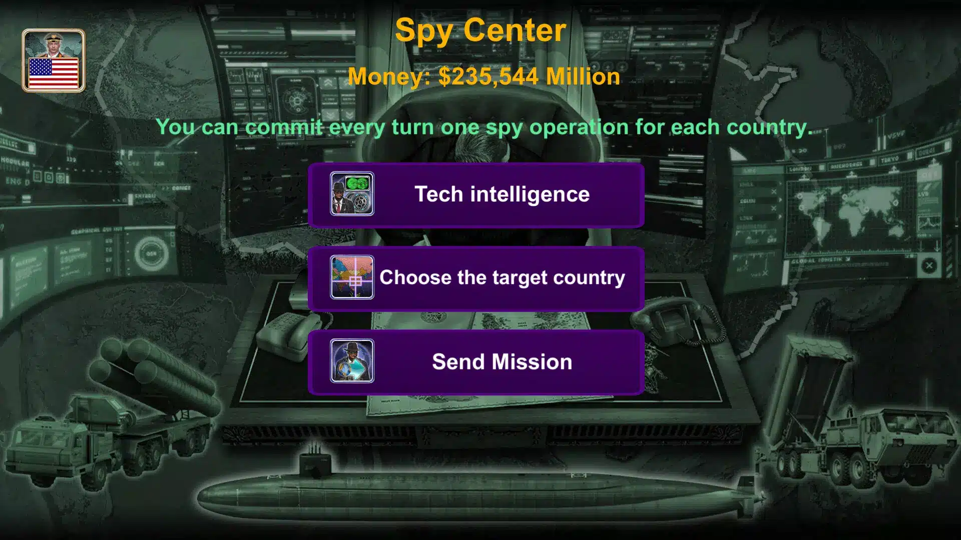 The game encompasses various features, including access to global Weapons Suppliers, a Spy Center, a War Room, Diplomats, the United Nations, an Economy system, Technology, and World News Distribution (Economy, Relations, Spy, and War). All these elements are powered by advanced Artificial Intelligence.