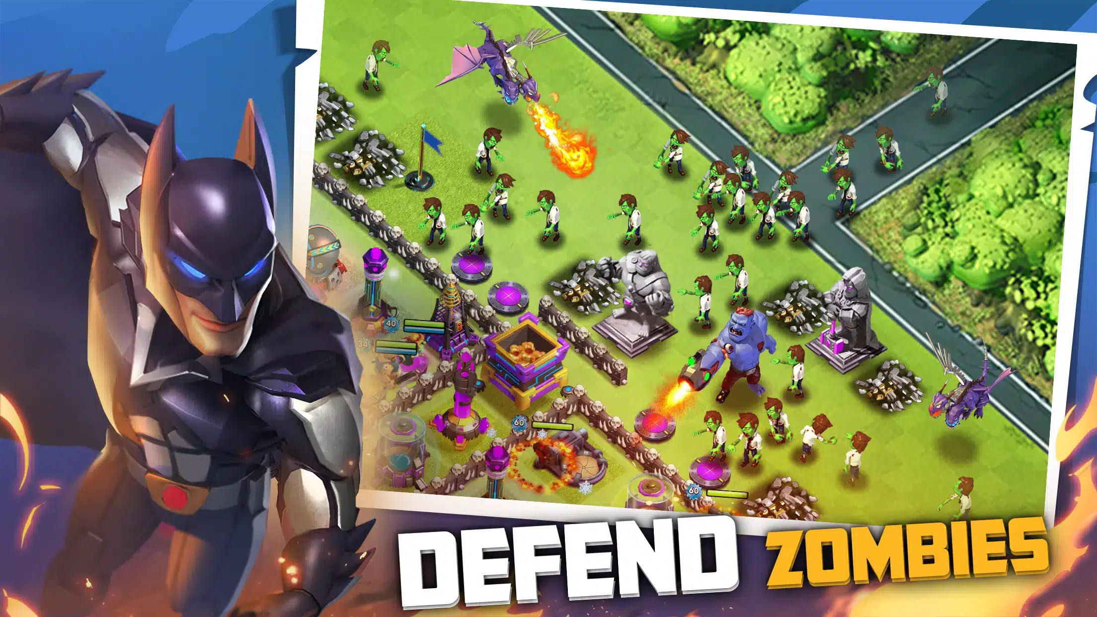The game features a diverse roster of heroes, each with unique abilities and roles in combat. Players must leverage these heroes effectively to take down powerful zombies and enemy bases.